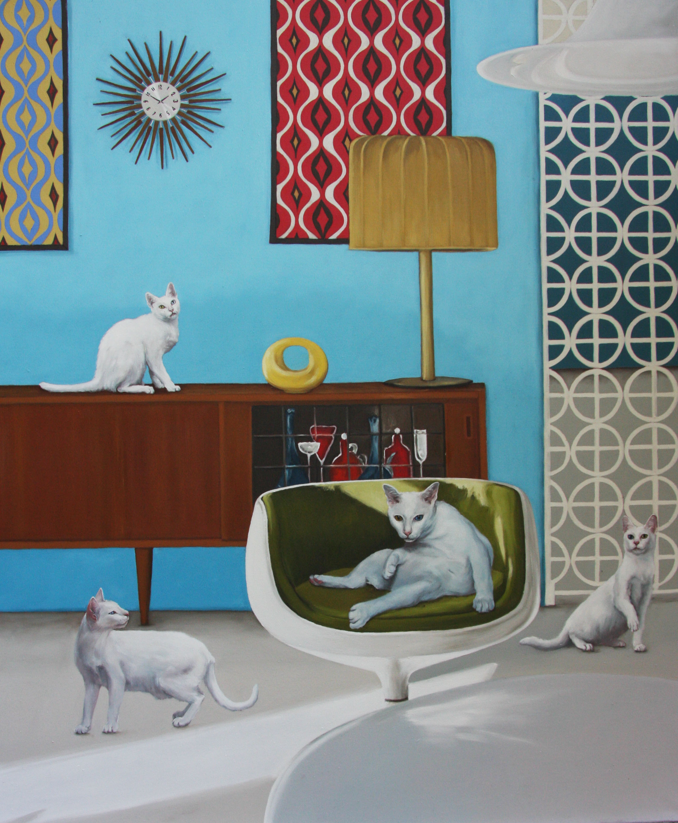 "Interieur mit Katzen", 2023, 100 x 120 cm, Öl auf Nessel