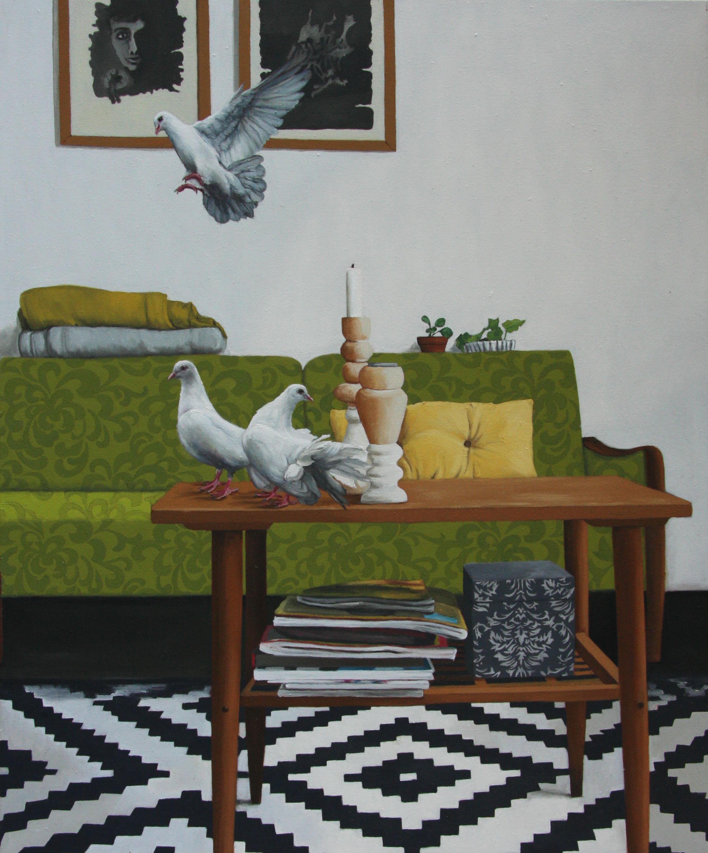 "Interieur mit Tauben", 2023, 70 x 85 cm, Öl auf Nessel