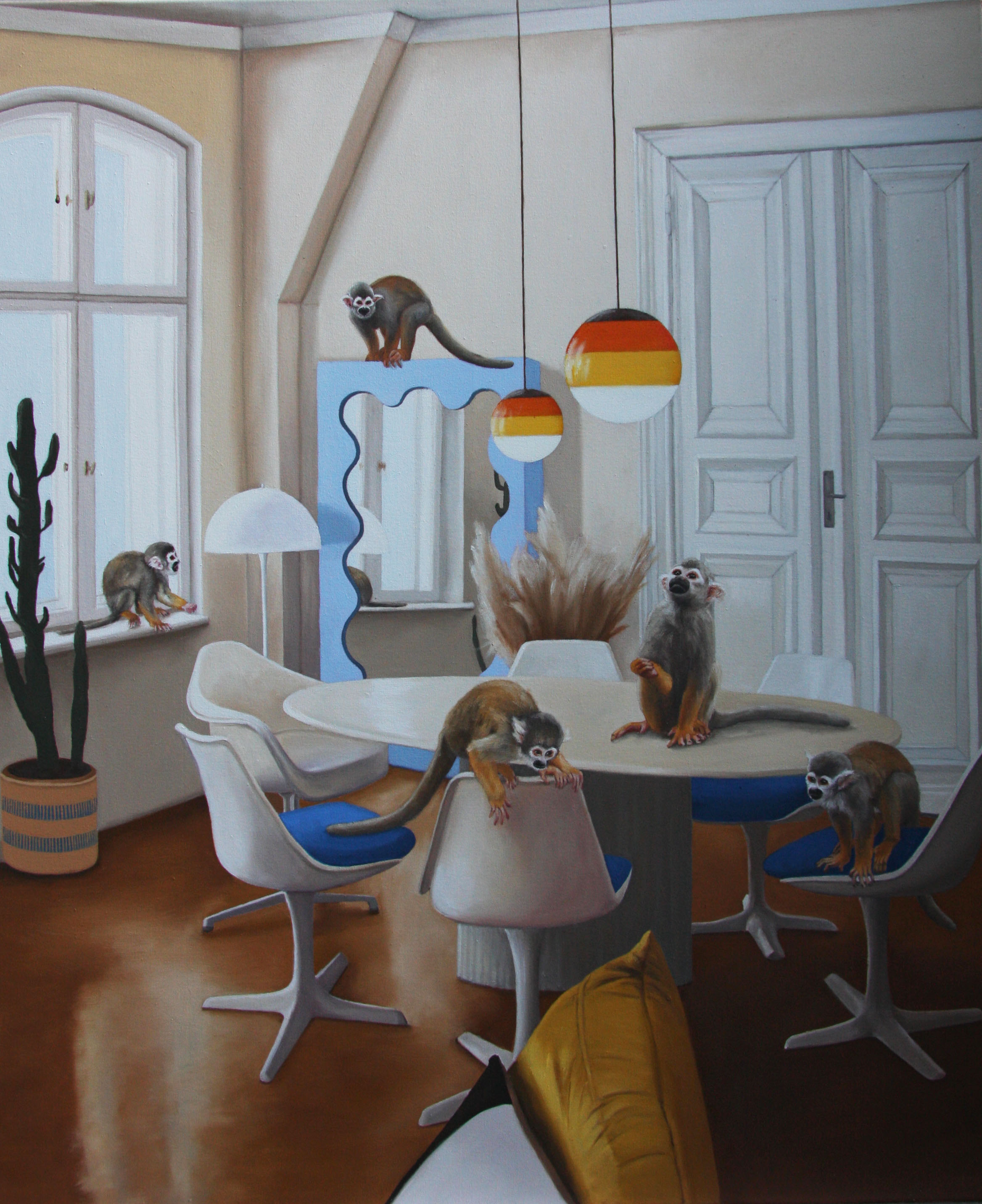 "Interieur mit Totenkopfäffchen", 2023, 100 x 120 cm, Öl auf Nessel