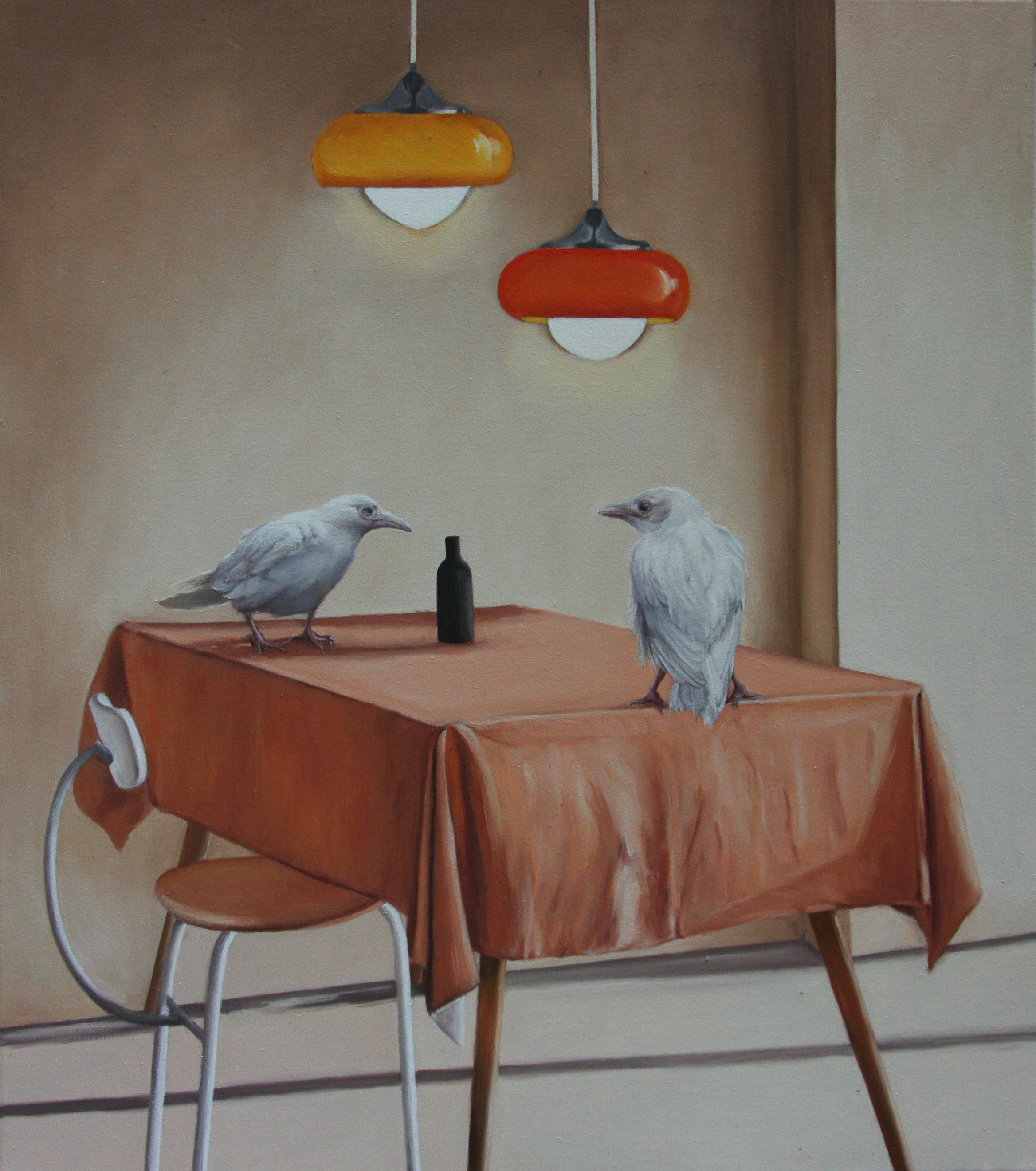 "Zwei weiße Raben", 2023, 75 x 85 cm, Öl auf Nessel